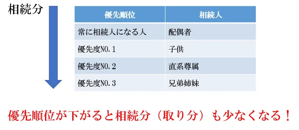 つまり、相続人の優先順位が下がれば、取り分である法定相続分も少なくなるということです。