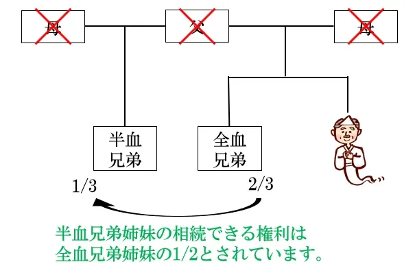 ちなみに、半血兄弟姉妹の相続分は全血兄弟姉妹の2分の1というルールになっています。