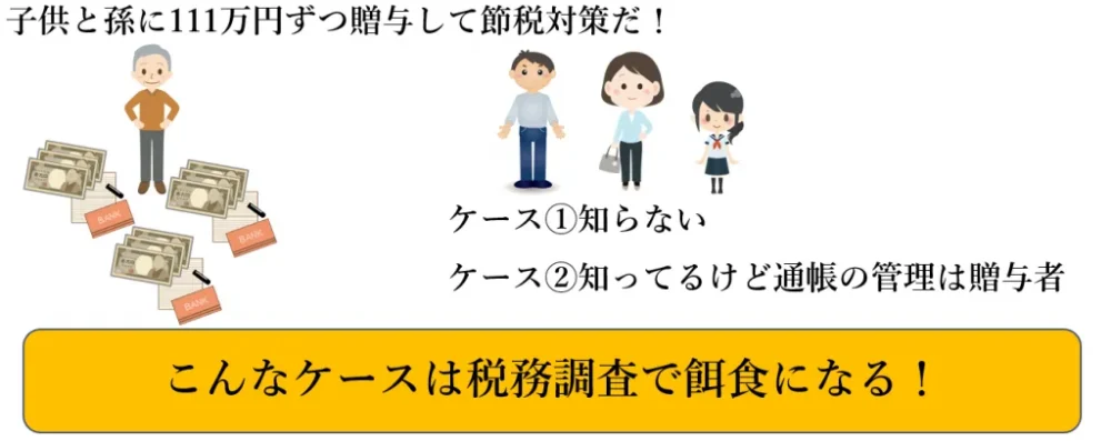 やり方さえ間違えなければ111万円贈与をすることで多少の相続税が節税できることは確かなことですが、やり方を間違えて税務調査の餌食になるケースもあります。