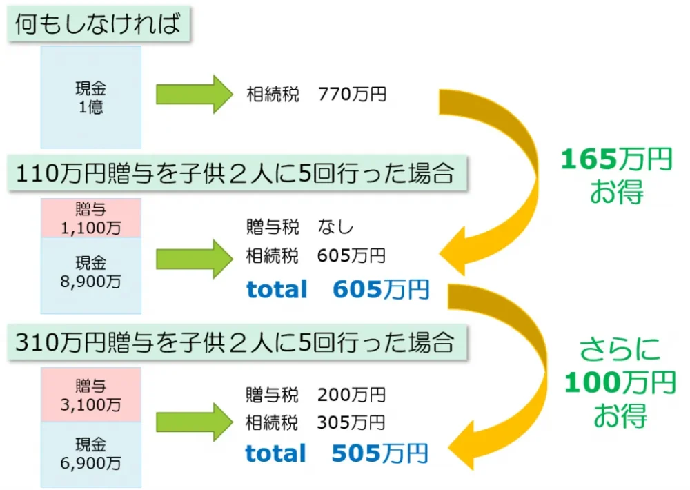 財産がいくらなのか、相続人は何人なのかによって異なりますが、110万円の贈与よりもたくさん贈与して贈与税を払った方が圧倒的に節税になる場合が存在するんです!