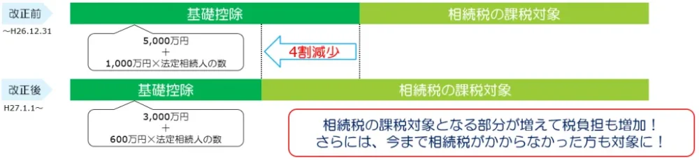 具体的には、平成26年12月31日までの相続等については基礎控除が「5,000万円+1,000万円×法定相続人の数」だったのですが、平成27年1月1日以降の相続等からは「3,000万円+600万円×法定相続人の数」に引き下げられたということになります。
