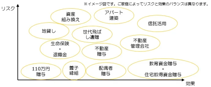 節税の方法にはいろいろな種類があります。よく耳にするものとして「110万円の生前贈与」や「養子縁組」があります。これらは低リスクで簡単に始められますが節税効果は比較的小さいといえます。逆に「アパート建築」のように何千万円単位の投資を行った節税は高い節税効果を発揮できる反面、何十年という期間の空き室リスクを抱え続けることになるハイリスクな節税方法ともいえます。