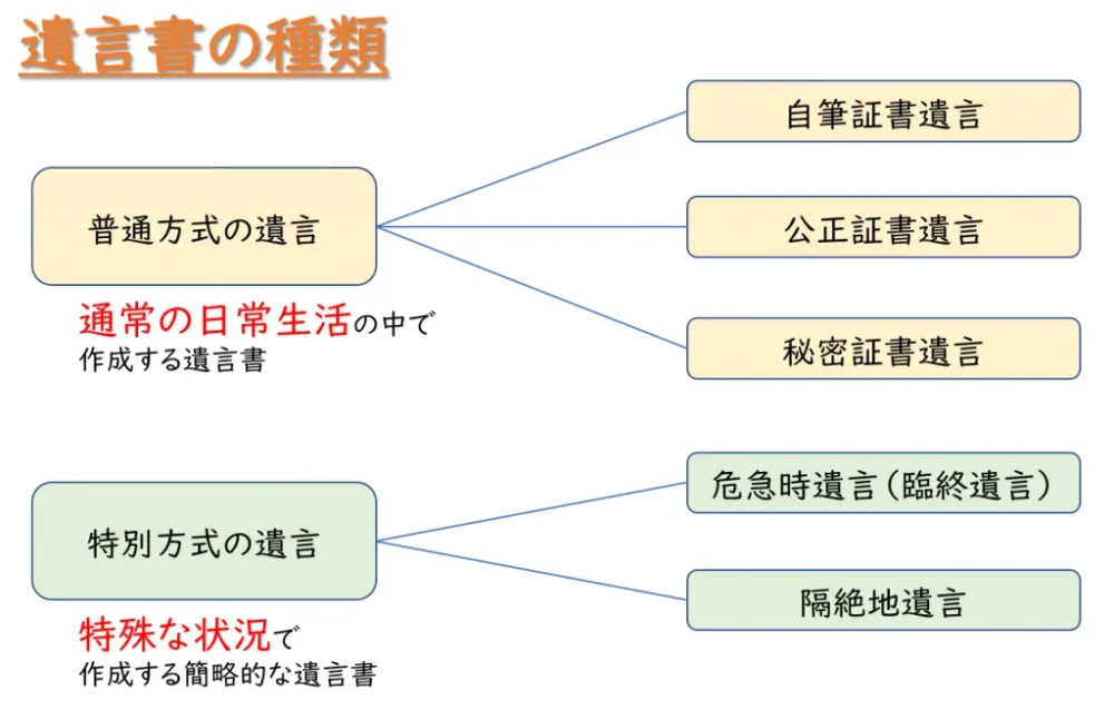 遺言書にはいくつかの種類があり、大きく分けると「普通方式の遺言書」と「特別方式の遺言書」があります。