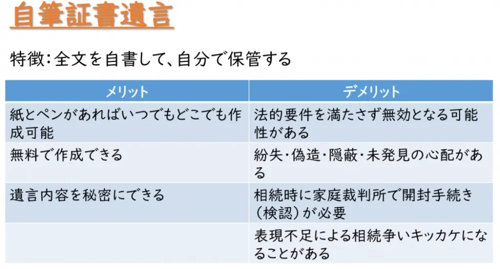 自分一人で作成が可能ですので無料で作成することができますが、書き方に厳格なルールがあるため法的要件を満たさずに無効とされる恐れのある方式です。