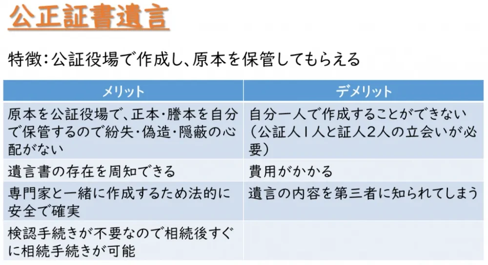 専門家と一緒に遺言書を作成するため法的要件で無効とされる心配がなく、さらには原本を公証役場で保管してもらえるため紛失等の恐れがなく、最も安全で確実な遺言方法です。