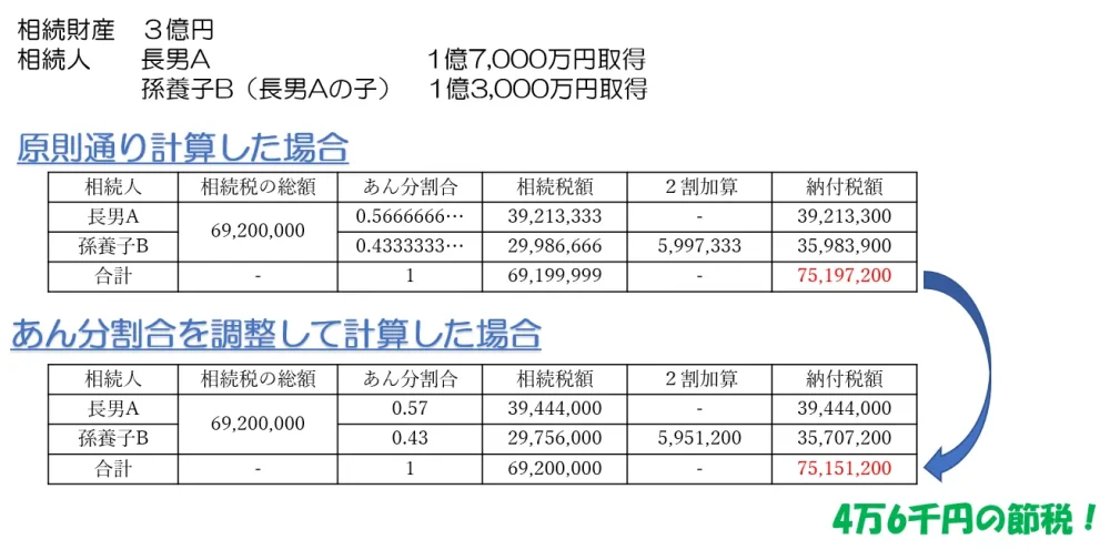 このようなケースでは長男Aの納付税額は増えてしまいますが、孫養子Bの納付税額はそれ以上に減額することができ、結果として相続人全員の納付税額の合計は4万6千円節税することができることになります。