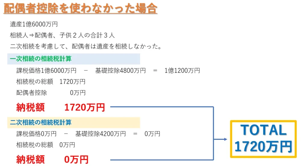 一つ目の配偶者控除をフル活用した場合よりも配偶者控除をまったく使わなかった方がトータルの相続税が安いのです!!