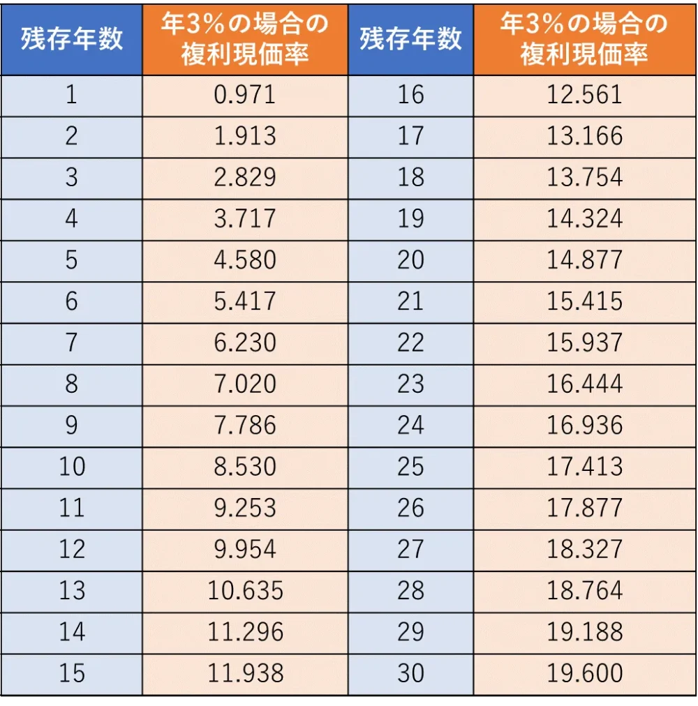 算式最後の「存続年数に応じた民法の法定利率に応じた複利現価率」については下記をご参照ください。