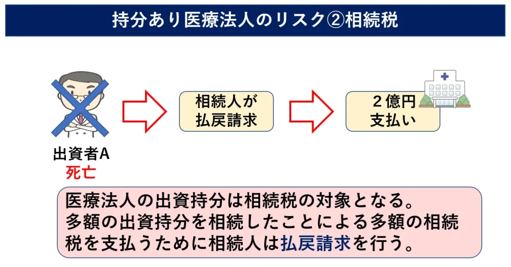 つまり、多額の出資持分を相続した場合には、多額の相続税が発生するため、相続人は納税資金に充てるために医療法人に対して払戻請求を行うことが考えられます。