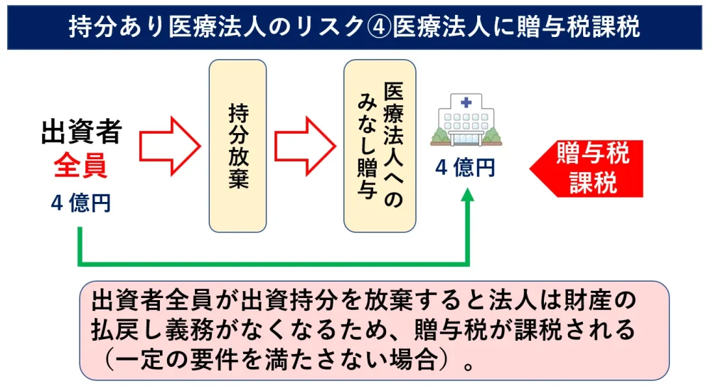 前述したとおり、通常、出資者全員が持分放棄した場合には医療法人に対して贈与税が課税されることになります。