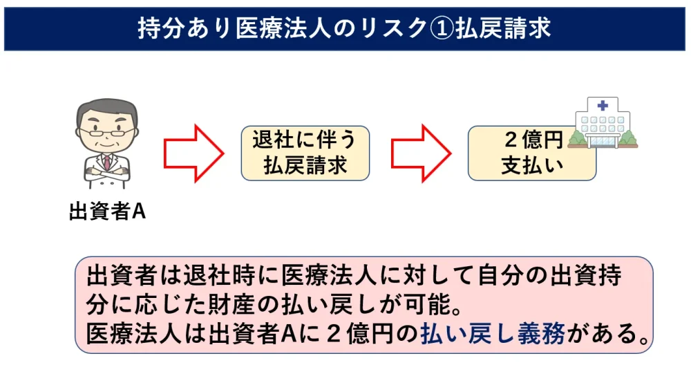 例えば、先ほどの例でいくと出資者Aが脱退する場合には医療法人はAに対して2億円を払い戻す義務が生じることになります。