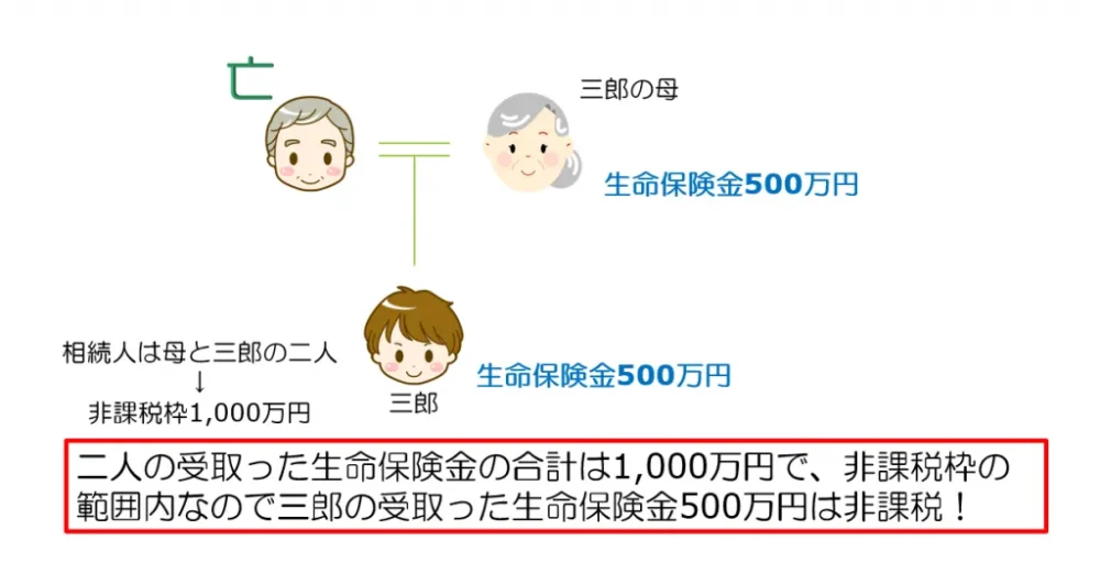 極端な話、上の例のように相続人が三郎と三郎の母だけの場合で、三郎だけが生命保険金1,000万円を受け取って、母は生命保険金を受け取らなかったようなケースでは三郎は生命保険金1,000万円がまるまる非課税になるのです!