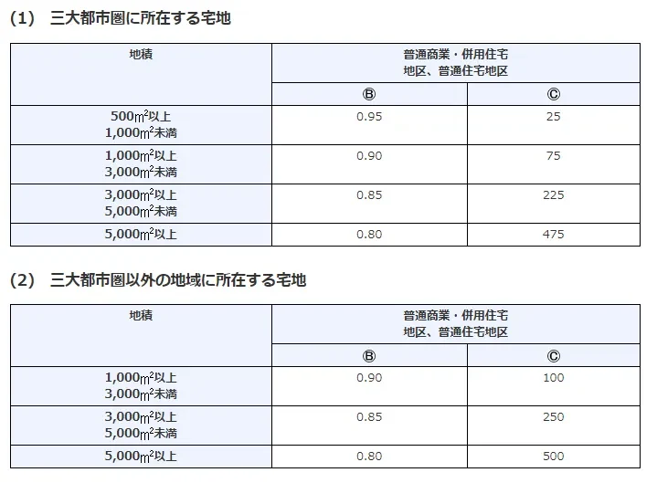 つまり、三大都市圏で500㎡の土地については0.8を乗じるため、通常の土地評価より0.2(20%)の土地評価減額効果があるということになります。