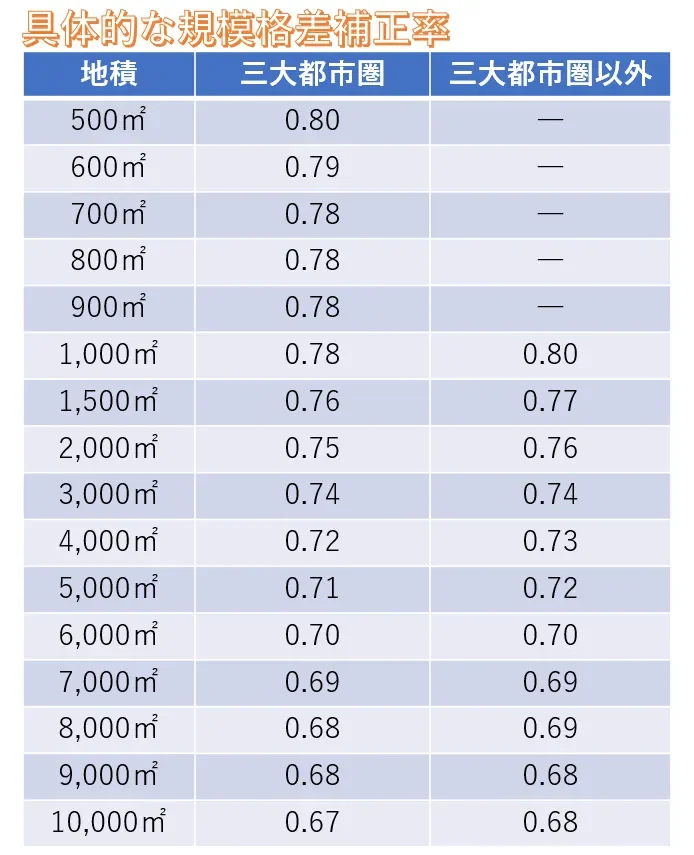 つまり、規模格差補正率は評価する土地の大きさや所在する地域によって変化するということになります。
