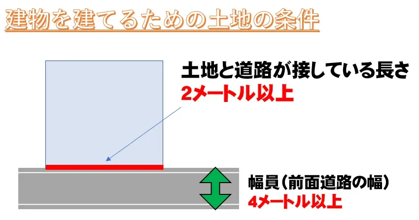 この建築基準法では、建築しようと思っている土地は幅員4m以上の道路に2m以上接している必要があると定められています。