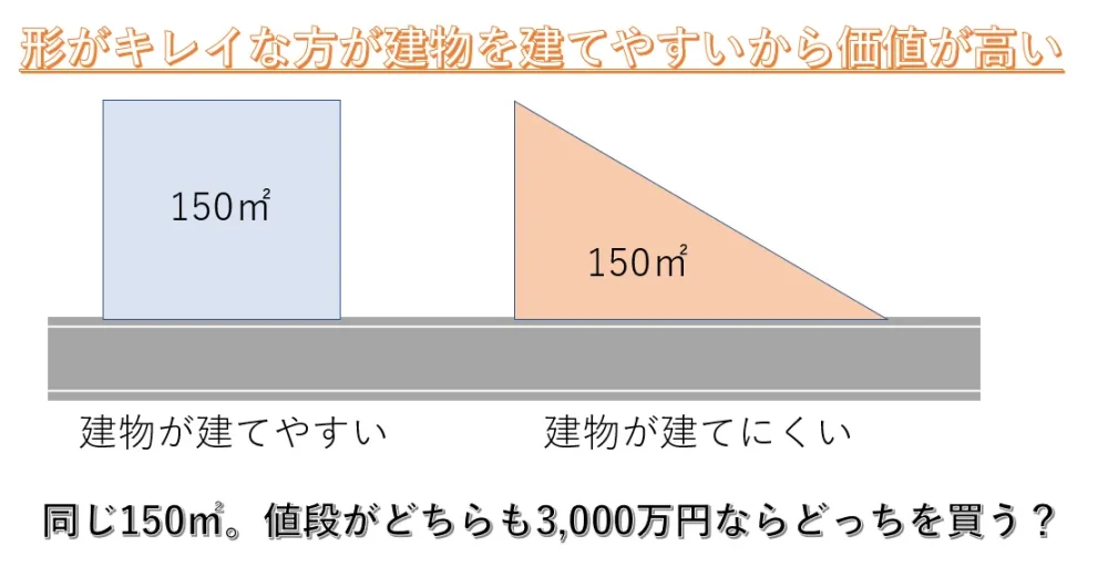 上のイメージ図のように、同じ面積で同じ値段であれば形がキレイな方の土地を買いたいですよね。