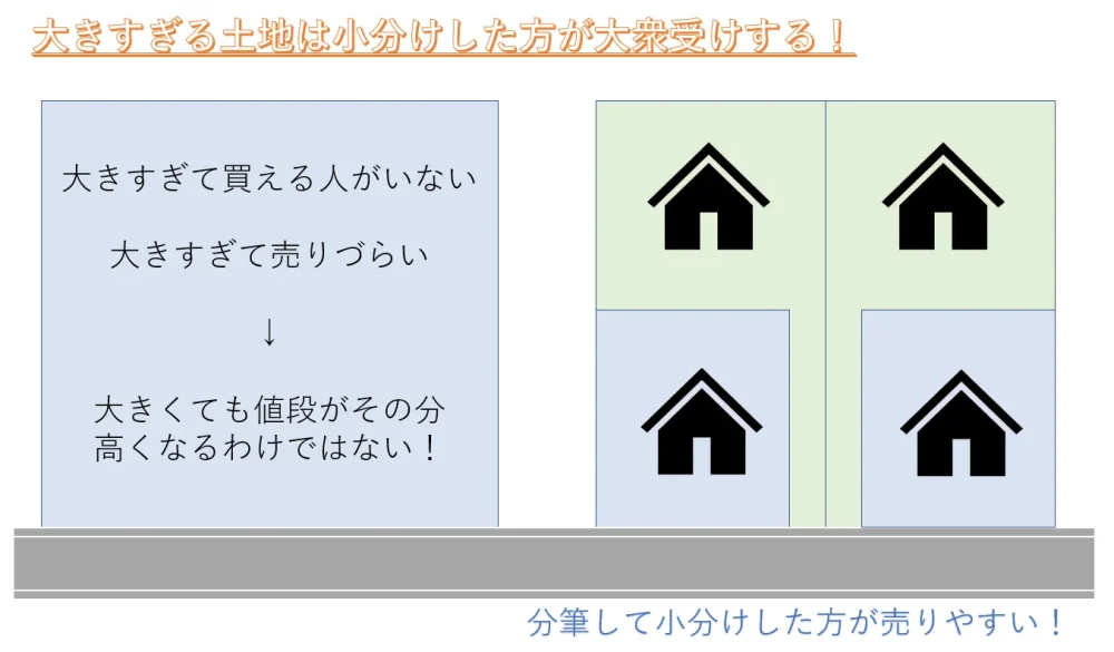 土地を売却する不動産屋にとっても大きすぎる土地は下の図のように小さく小分けして売った方が売りやすいというわけです。