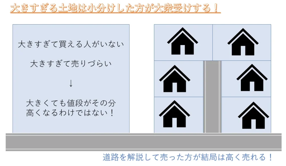 いずれにしろ、大きすぎる土地はこのようにお金をかけて小分けしなければ実際には売れないということです。