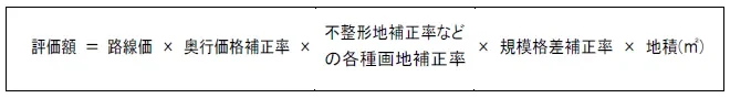 ②その宅地が標準的な間口距離及び奥行距離を有する宅地であるとした場合の1平方メートル当たりの価額に、普通住宅地区の奥行価格補正率や不整形地補正率などの各種画地補正率のほか、規模格差補正率を乗じて求めた価額に、その宅地の地積を乗じて計算した価額